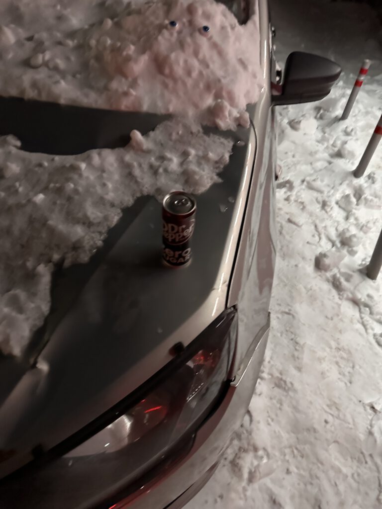 Вызвал полицию, купил Dr. Pepper — стоять на морозе в ожидании всё равно долго. Потом дошло: слишком много снега вокруг. Это не вандалы — это сход снега с крыши соседнего дома. Недавно была оттепель, и вся эта масса рухнула прямо на машину.